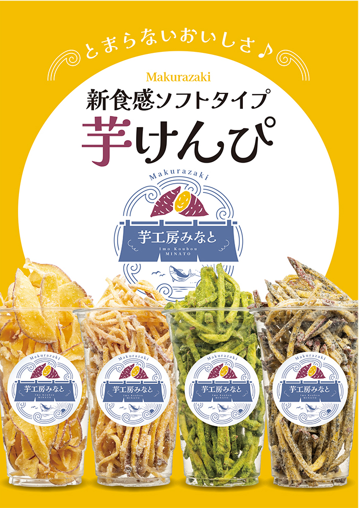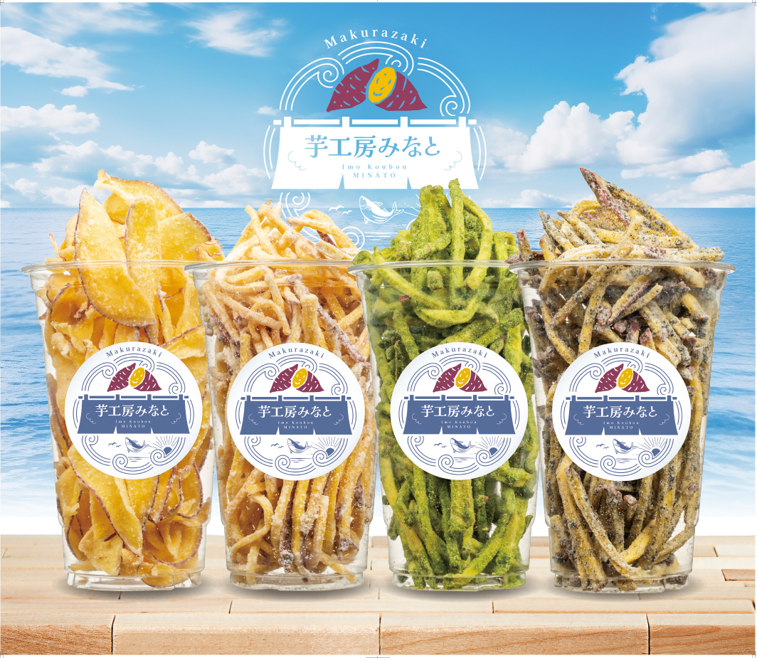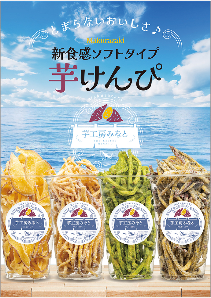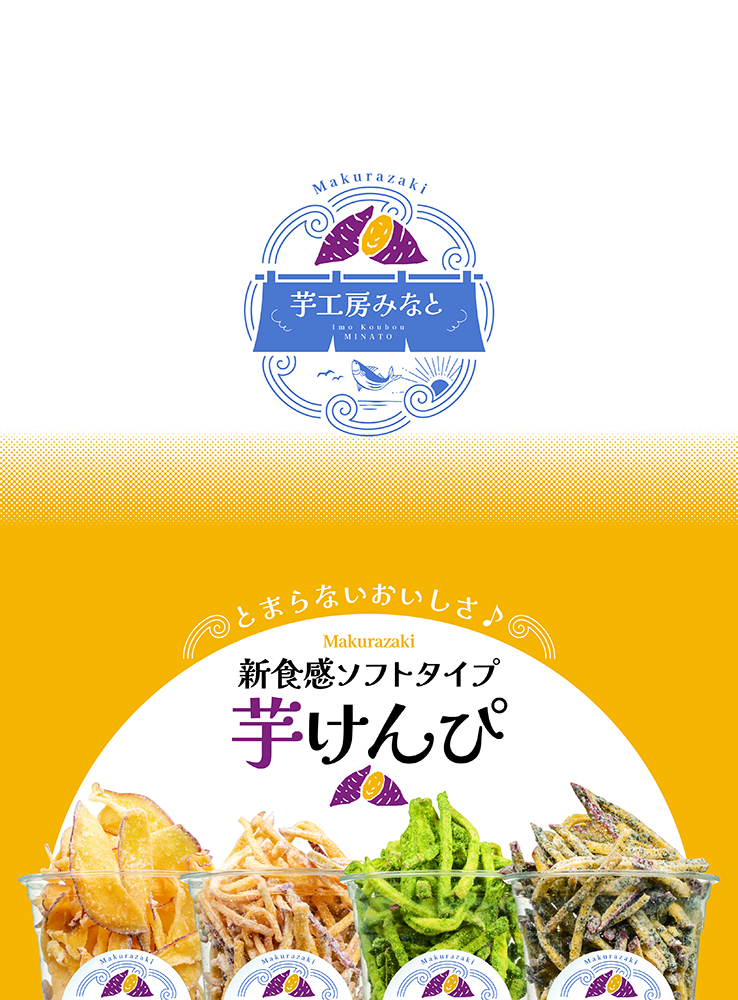 鹿児島県枕崎市にある「枕崎お魚センター芋工房みなと」様の、いもけんぴ販促に向けた各種ツールのデザイン・製作をさせていただきました。ロゴマークをはじめ、のれん、パネルシート、テーブルクロス、POP、商品シールなど、店舗での展開や商品販促に必要なツール一式をトータルでご提案しています。