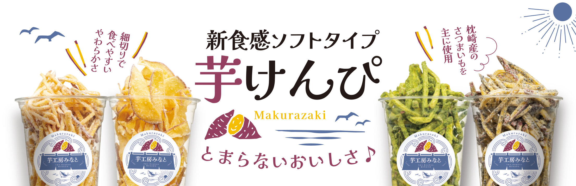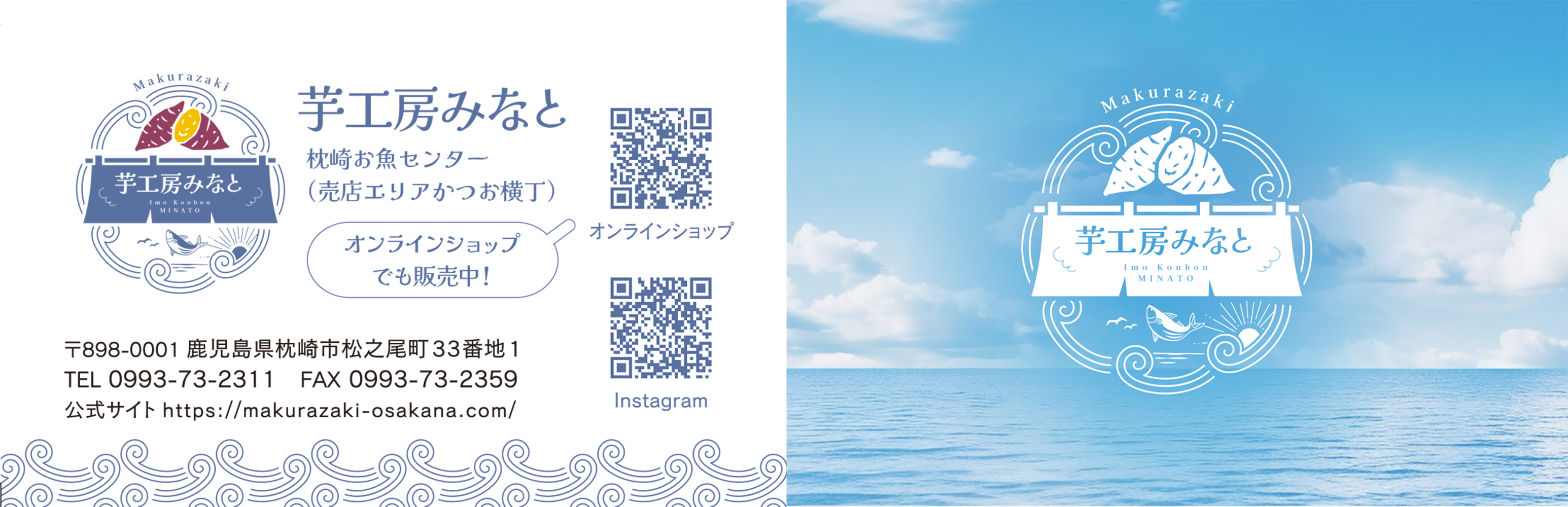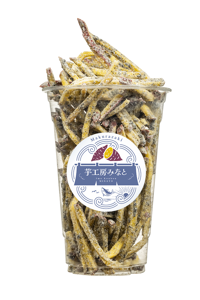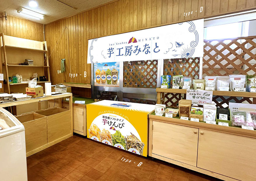 鹿児島県枕崎市にある「枕崎お魚センター芋工房みなと」様の、いもけんぴ販促に向けた各種ツールのデザイン・製作をさせていただきました。ロゴマークをはじめ、のれん、パネルシート、テーブルクロス、POP、商品シールなど、店舗での展開や商品販促に必要なツール一式をトータルでご提案しています。