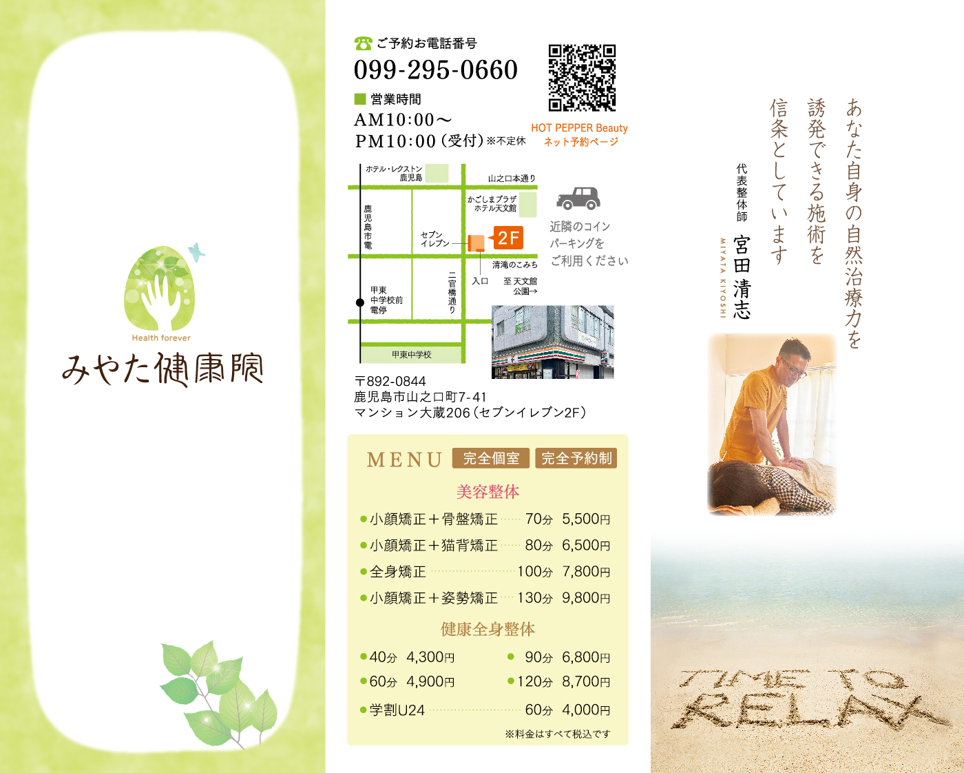 鹿児島市内の天文館近くにて、「あなた自身の自然治癒能力を誘発できる施術」を信条としながら施術をされているみやた健康院様。肩の凝りを指圧で刺激するほぐし方とは異なり、施術によって肩の力を抜かせることで凝りを改善する、新しい施術を行われています。ロゴマークとリーフレット、ホームページを制作させていただきました。