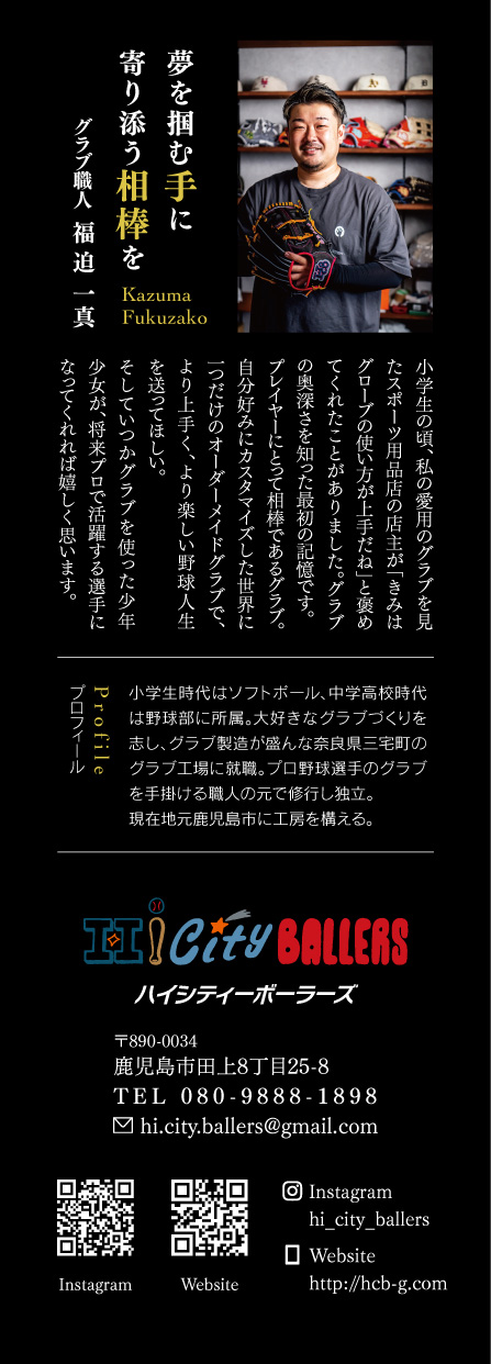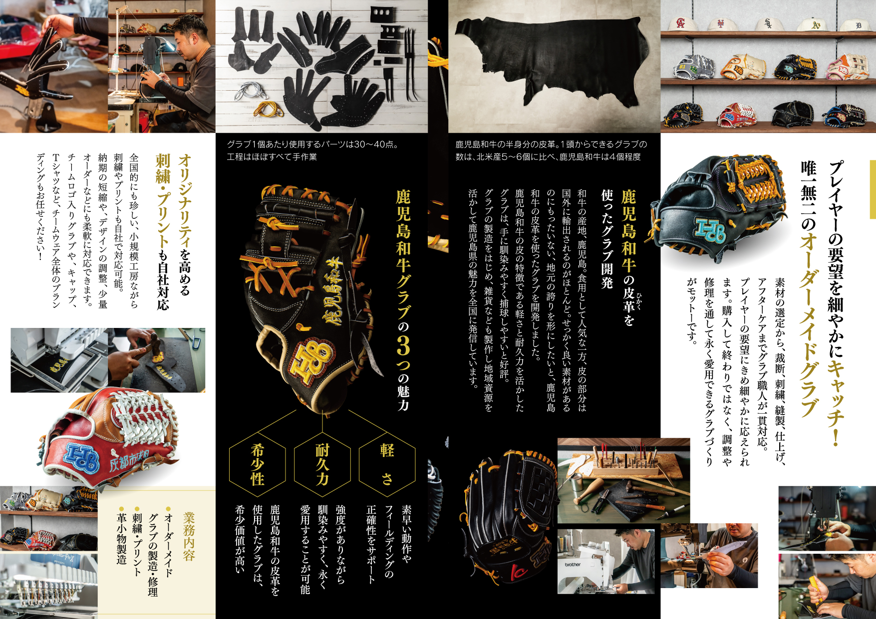 Hi.City.Ballers様 鹿児島和牛皮革を使ったオーダーメイドグラブを販売されているHi.City.Ballersのグラブ職人、福迫一真様のリーフレットを制作させていただきました。仕様はA4サイズの観音折です。 表 裏 扉 中