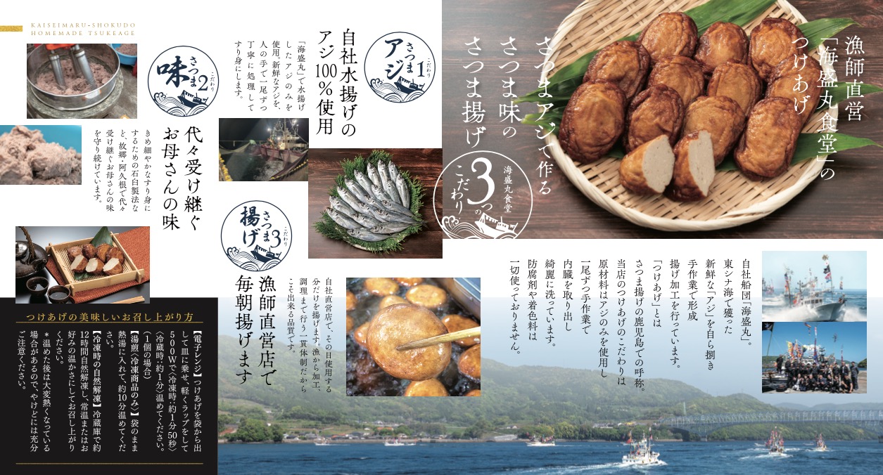 鹿児島県の阿久根市で昭和57年に設立された水産会社さま。漁から加工、食堂の運営もすべて自らで行っています。つけ揚げは自社で水揚げしたものを100パーセント用いております。
